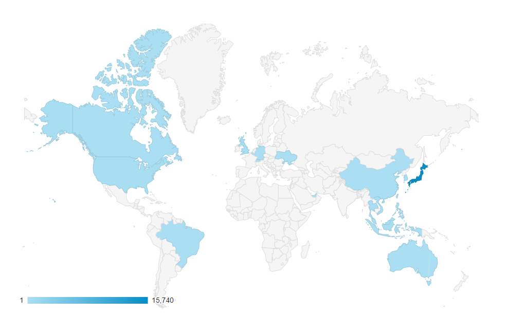 アナリティクスをたまに見ると、アメリカ、中国、インドネシア、香港、オーストラリア、シンガポール、台湾、ドイツ、タイ、カナダ、マレーシア、スイスなどなどいろんな国からのアクセスがあります。